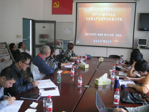 最后,大家通过宣传家网观看了国家行政学院一级教授许耀桐《全面从严治党开启新征程》的学习辅导报告,该报告认为十八届六中全会对全面从严治党做出的三个贡献,重点说明了《关于新形势下党内政治生活的若干准则》和《中国共产党党内监督条例》的新提法新亮点。