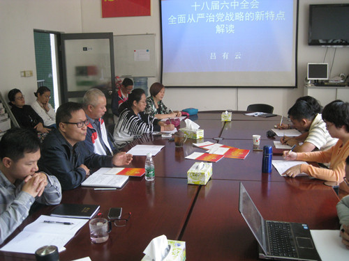 思政部主任吕有云做了《十八届六中全会全面从严治党的新特点》的报告。他从毛泽东与黄炎培谈话讲起,回顾了我党治党历史。他认为六中全会有三个亮点或特点,一是思想治党和制度治党双管齐下,二是全面从严治党在关键少数,三是全面从严治党从治标走向治本。他的报告,使大家对六中全会的基本精神有了一定的了解。