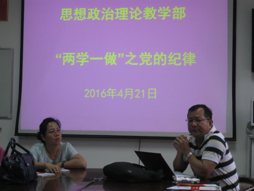 随后,老师们围绕中央办公厅“两学一做”学习教育专题方案和肖博士的辅导进行了讨论,大家认为我党这几年严抓党纪,对于加强党的建设,密切党群关系,巩固党的领导具有重大意义;表示思政课教师遵守党纪重点体现在“两课”教学中,体现在课堂上,体现在与学生的交往中,老师首先要管好自己。有老师提出要优化微信政治生态,要在微信群落弘扬正能量,既要反右,又要反左,不传谣言和封建迷信。