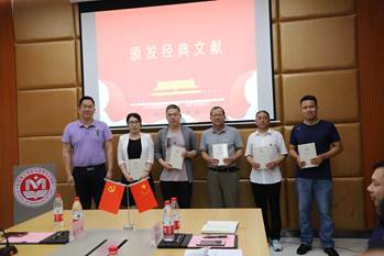 接下来,与会党员一同为肖凤良、李仕波、王贺、杨云安、徐家琦等五位党员过政治生日。五位思政课教师党员表达了对党的赤诚忠心、对理想信念的坚守和以“六要”标准严格要求自己的决心。与会嘉宾郑林锋同志为五位党员颁发了纪念品马克思、恩格斯合著的《共产党宣言》。他高度赞扬了本次活动的意义和价值,并结合自己在社区抗疫的工作经历,生动诠释了“不畏艰险,迎难而上,就是一个共产党员的初心使命”的深刻命题。