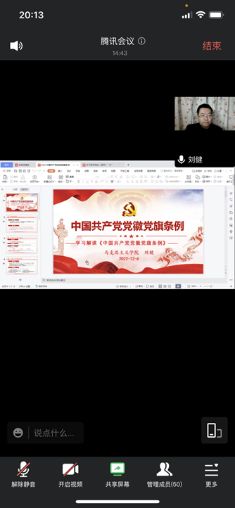 12月6日,kaiyun登录中国入口登录党委书记、执行院长刘健在线上领学《中国共产党党徽党旗条例》。马院全体教职员工参加会议。