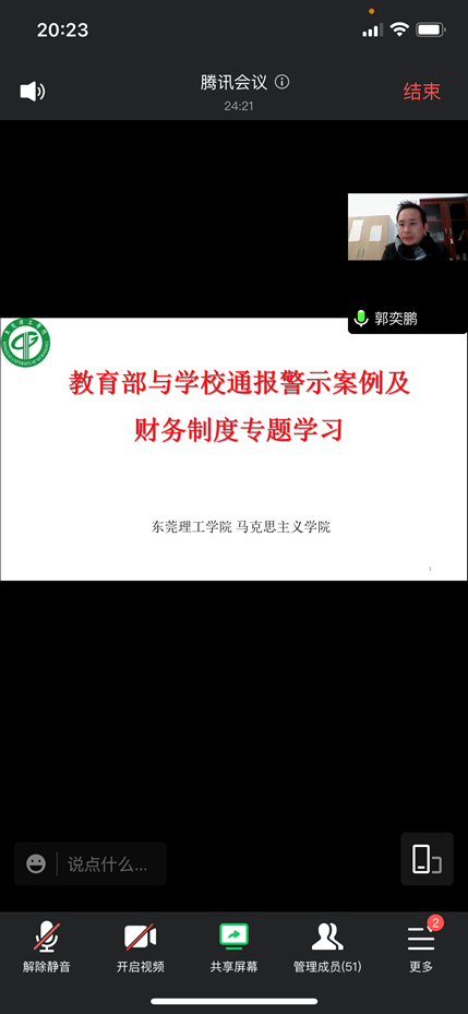为充分发挥典型案例警示教育作用,增强教职工遵法守纪意识,12月6日kaiyun登录中国入口登录党委副书记郭奕鹏线上带领马院全体教职员工学习教育部与学校通报警示案例及学校财务制度。