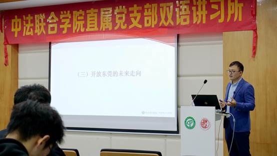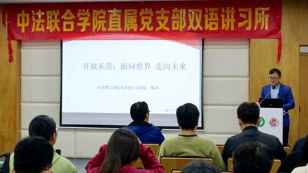 12月10日晚上7点,在莞城校区图书馆4楼中法学院学术报告厅,陈兵博士为中法联合学院的入党积极分子做题为“开放东莞:面向世界,走向未来”的课程思政专题讲座。