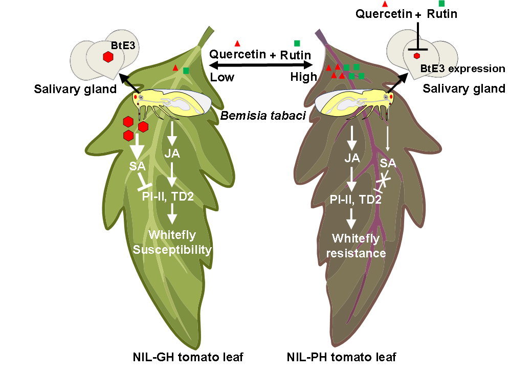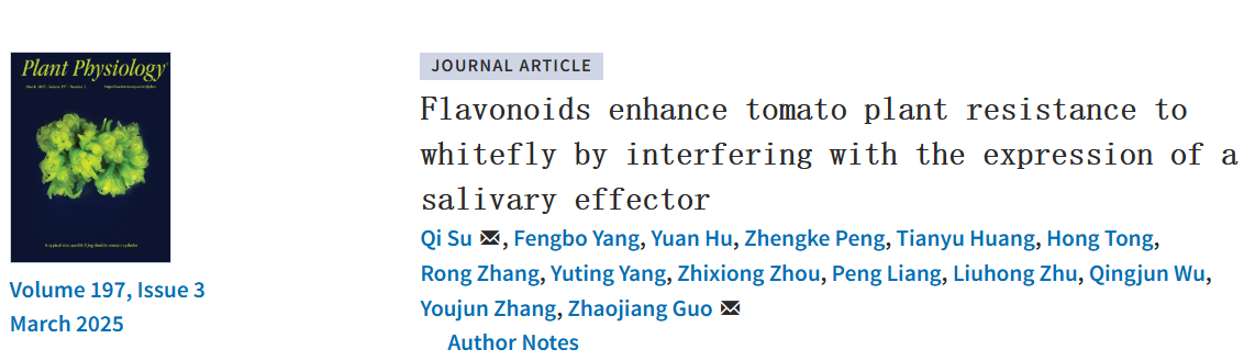 近日,2026世界杯官网苏奇团队和中国农业科学院蔬菜花卉研究所张友军团队在Plant Physiology上发表题为Flavonoids enhance tomato plant resistance to whitefly by interfering with the expression of a salivary effector的研究论文,揭示了防御性次生代谢物类黄酮(槲皮素和芦丁)增强番茄对烟粉虱抗性的分子机制,该研究揭示了槲皮素和芦丁在番茄防御烟粉虱中的关键作用和调控机制。