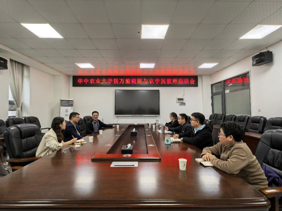 随后,杨万能教授与我院副院长张运波、院长助理兼农学系主任邓锋林,以及教师代表曾凡荣、覃元、朱相潜等人举行座谈。双方围绕 “作物表型平台设计与落地建设”“交叉学科教学科研团队组建与人员配置”“智慧农业方向培育与发展”“作物学一流学科内涵建设” 等关键议题深入交流,杨教授结合自身团队经验与行业前沿趋势,为我院学科专业建设、特色方向发展提供了兼具专业性与可操作性的指导建议。