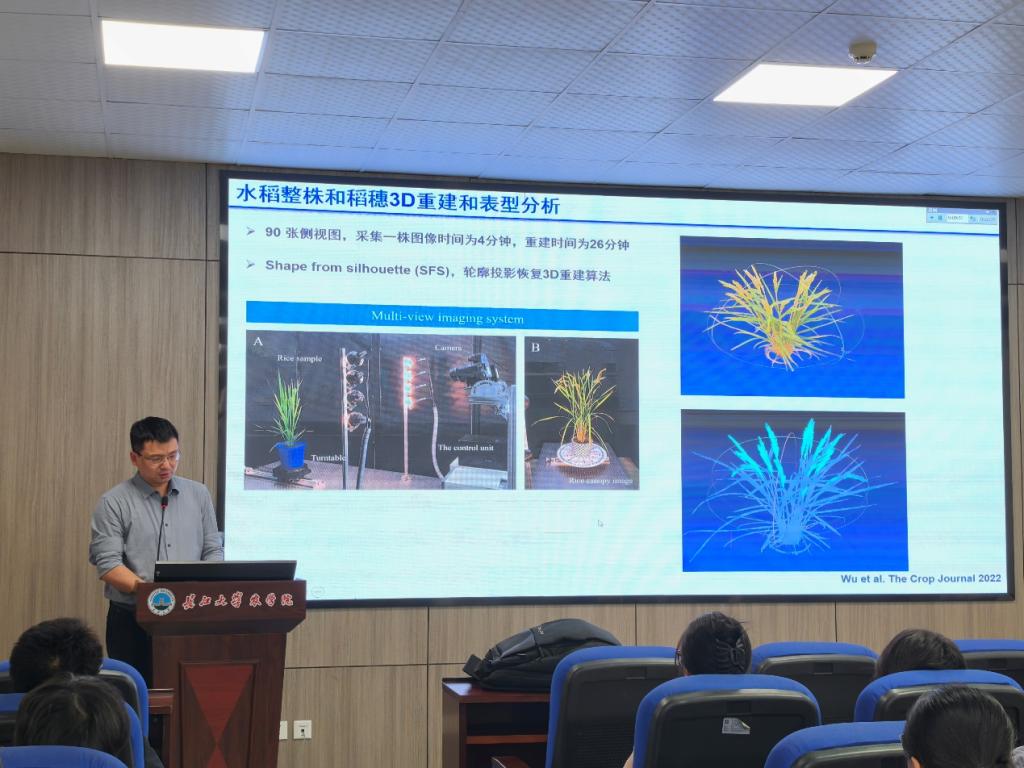 首先,杨万能教授为我院师生作题为“作物表型组学前沿技术研究与应用”的学术报告。在报告中,杨教授通过生动有趣的案例、通俗易懂的语言,详细介绍了其团队围绕作物性状表型数据“高通量、高质量、高效率”采集及分析目标,自主研发设备、编写程序的过程,同时分享了研发过程中遇到的技术瓶颈与创新解决思路;此外,还系统阐明了作物表型分析技术与基因组、代谢组等技术联合应用,进而挖掘作物关键功能基因的经典实践案例。报告结束后,杨教授与师生围绕“平台与传感器选择”“表型分析模型构建”等核心问题展开深入研讨,耐心解答师生疑问。此次报告有效开拓了师生学术视野,进一步激发了大家对农业信息技术、智慧农业等新兴领域的研究兴趣。