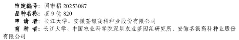 (通讯员 王雪)近日,农业农村部和湖北省农业农村厅分别发布审定农作物新品种的公告,世界杯官网水稻遗传育种团队杨隆维教授主持选育的“荃9优820”(国审稻20253087)通过了国家审定,杨隆维教授和邱先进教授主持选育的“航八占”(鄂审稻20251016)和“长农糯22117”(鄂审稻20251019)通过了湖北省审定。三个品种具备优质、高产、抗稻瘟病、熟期适宜等特点,未来可以在湖北省及长江中下游地区推广,对推动实现种业科技自立自强、种源自主可控具有重要意义。