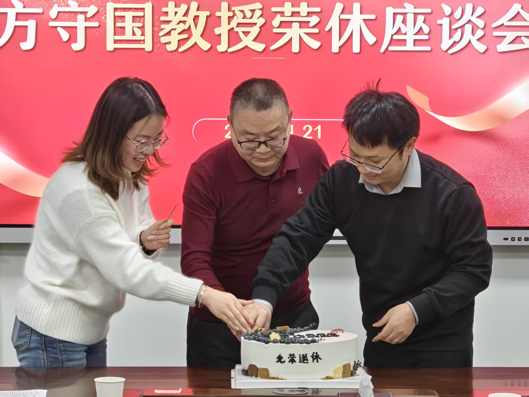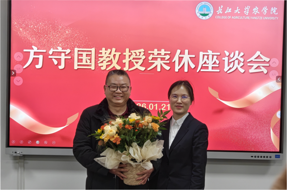 (通讯员 张明静)2026年1月21日下午,农科大楼3064会议室内暖意流淌,学院领导班子与植保系全体教师齐聚一堂,为奉献教育事业数十载的方守国教授举行荣休座谈会。植保系主任邓建新教授主持仪式,现场鲜花与蛋糕交织,演绎薪火相传的师德颂歌。