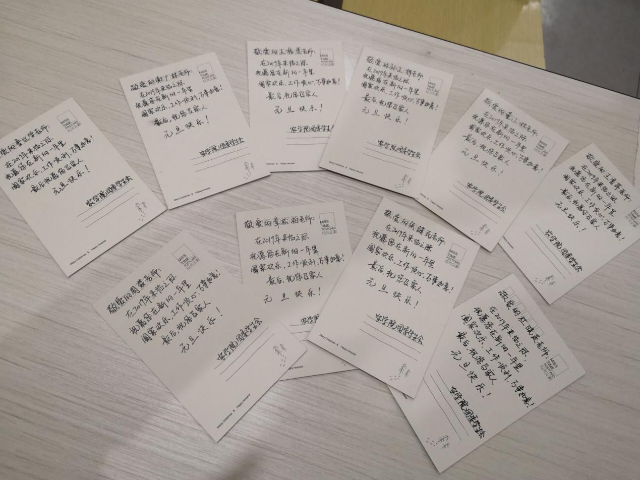 大雪初现,一夜之间湖边都堆满了积雪。但校园依旧春意盎然,处处都充满着暖意。我院学生给老师精心准备了贺卡,一笔一划间都传递着学生们对辛勤付出的老师的感激、感恩和对新年的期盼。
