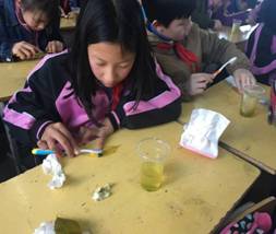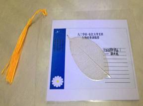 训练营成员分组认真指导学生清洗树叶、分离叶脉。经过将近半个小时的努力,所有同学都成功地梳理出叶脉,训练营成员给所有叶脉都进行了染色和过塑,一枚枚漂亮又独具个人特色的书签制作完成了。