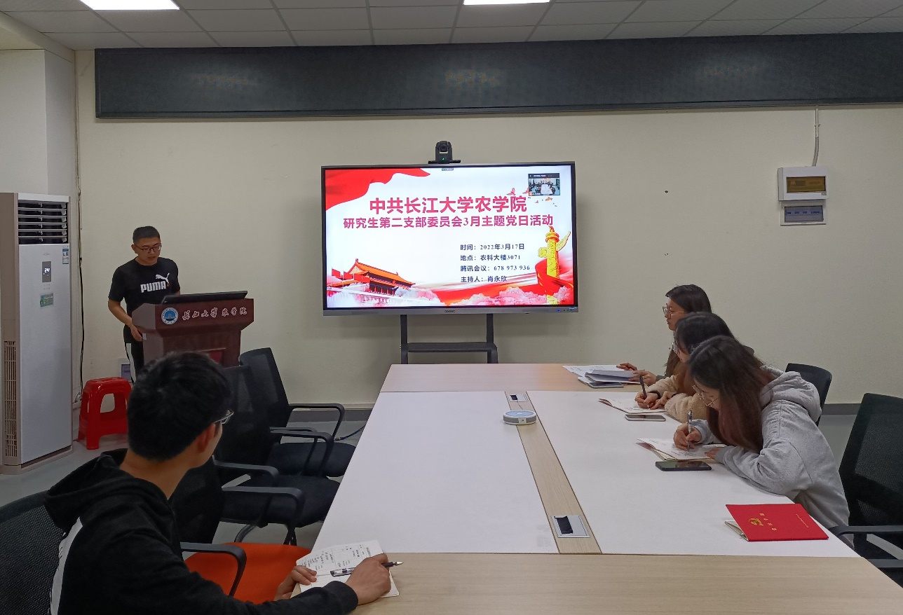 于3月17日晚上7点,我院研究生第二党支部在农科大楼3071开展了3月份主题党日活动,活动结合腾讯会议的方式开展。全体在校党员和校外联培党员参与了此次活动,会议由支部副书记肖永欣主持。