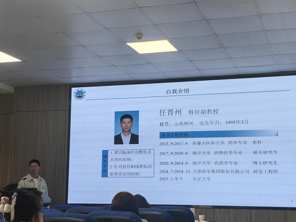 沙龙上,李俊凯教授介绍了课题组发现的高效杀菌候选物,其韧皮部传导性及杀菌活性超越阳性对照,展现出广阔的应用前景;杜晓英教授结合田间药效试验案例,强调了生测数据的重要性,帮助学生深入理解实践研究的价值;徐志红副教授和朱祥副教授从不同角度阐释了新农药创制的多样性,拓宽了师生的科研视野;张小磊副教授分析了荆州市周边地区杀虫剂抗药性现状,呼吁科学合理用药;任晋州副教授系统讲解了新型杀虫靶标鱼尼丁受体及双酰胺类杀虫剂的研究进展,为相关领域提供了新思路。