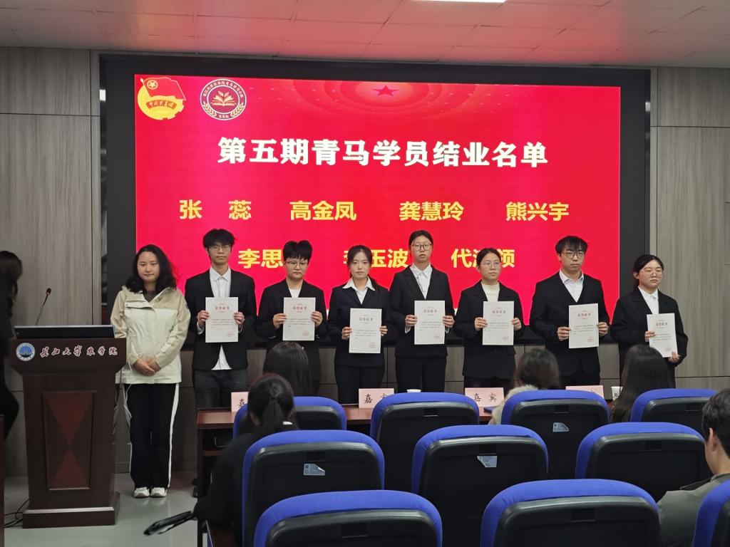 本次会议由李艳梅担任主持人,在大家的掌声中第五期学员结业答辩正式开始。经过为期一年的学习与实践,学员们带着丰硕的学习成果登台展示。他们围绕理论学习感悟、实践收获等内容,结合自身在青马小组的成长蜕变,展现新时代青年学子坚定的理想信念与扎实的综合素养。随后,唐玉婷老师依次给第五期青马学习小组学员颁发结业证书。现场掌声不断,既是对第五期青马学员圆满结业的祝贺,也传递着对他们未来继续发光发热的期许。