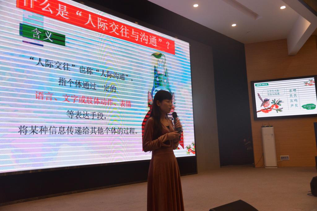 培训中,万钰从“什么是人际交往与沟通”、“社会支持系统”、“人际冲突发生时的解决步骤”三个方面讲解大学生如何解决在人际交往时出现的问题。提到寝室室友之间的交往时,万钰现身说法,以自己在大学时期的亲身经历为大家化解常见的冲突。针对学生骨干,万钰提醒他们应多多关注身边不爱说话、喜欢独来独往的同学,发现问题积极上报,及时解决问题是每一个学生骨干的责任。