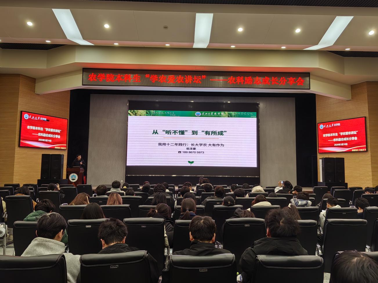 侯泽豪老师则以自身农科求学成长历程为主线,讲述了从专业入门时的迷茫困惑,到逐步探索、深耕钻研,最终学有所成的励志故事。他求学初期攻坚克难、自主钻研,研究生阶段在反思中超越自我、提升能力,博士阶段深耕拼搏、实现农科梦想,其经历生动诠释了坚持与热爱的力量,让在场学子明白困难与挑战都是成长的宝贵财富,激励大家以坚定信念面对专业学习中的挑战。
