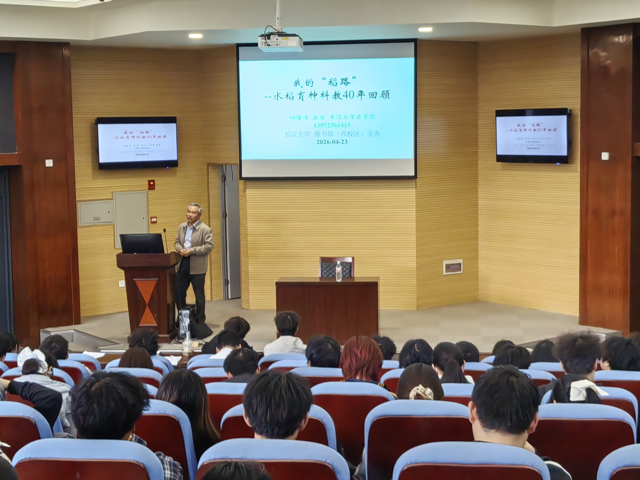 (通讯员 胡雪晴/文 吴泓萱 张源康/摄)为厚植学子学农爱农情怀,筑牢强农兴农使命担当,2026世界杯官网图书馆联合我院于2026年4月23日在西校区七里湖报告厅举办“书香长大·悦读荆楚”全民阅读系列活动暨阅读素养讲座第1期。本次讲座邀请了杨隆维教授进行《我的稻路——水稻育种四十年之回顾》主题分享,吸引了世界杯官网师生、阅读学社成员共150余人到场聆听。