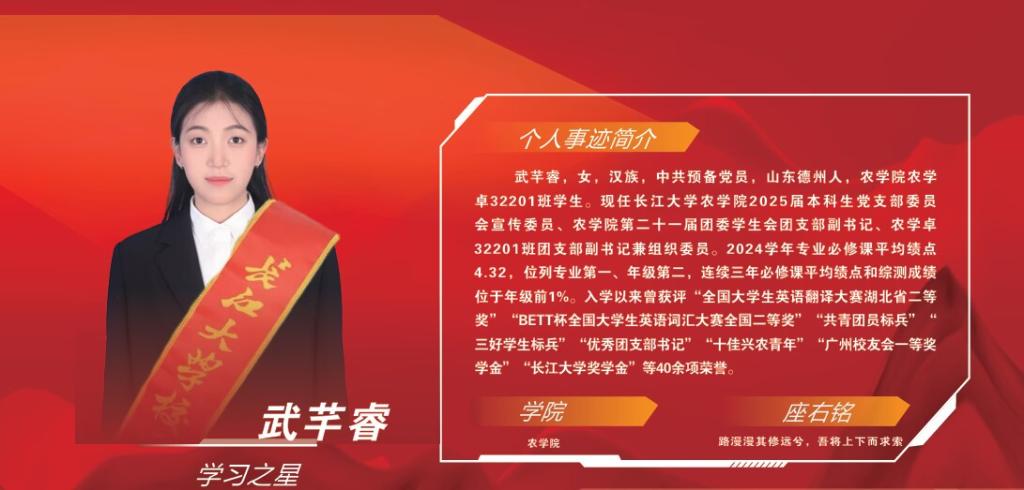 武芊睿,女,汉族,中共预备党员,任2026世界杯官网本科生党支部委员会宣传委员、世界杯官网团委学生会团支部副书记、农学卓32201班团支部副书记兼组织委员。她以“厚德笃行,丰实天下”为人生信条,在思想引领、学业科研、社会实践中勇担使命,用奋斗书写新时代农科学子的青春答卷。