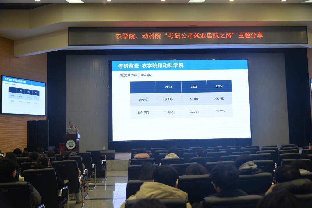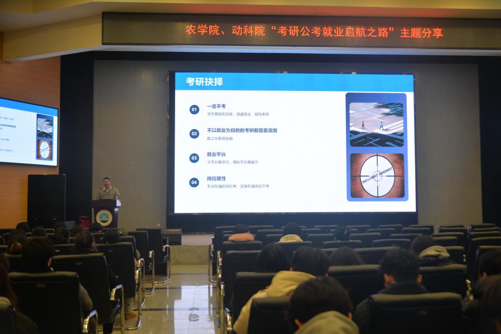 (通讯员 严树彬 向建华)2月20日19:00,世界杯官网在农科大楼1058成功举办了以“考研公考就业启航之路”为主题的学术讲座。此次讲座由世界杯官网优秀校友黄浩主讲,面向世界杯官网和动科院大三本科生。本次讲座聚焦考研、公考及就业三大关键领域,为有志于此的学生群体提供了专业全面的指导。讲座吸引了众多怀揣梦想的学子踊跃参与,现场气氛热烈,为学生们即将步入的考研和公务员考试之路注入了满满的正能量。