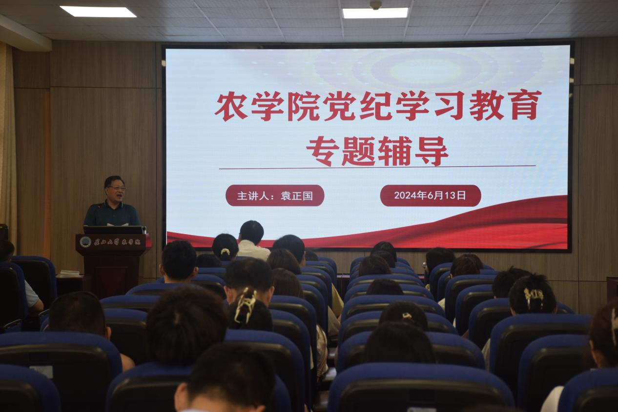为教育引导广大党员学纪知纪,更好地实现党纪学习教育全覆盖,推动形成浓厚学习氛围,6月13日下午,学院于农科大楼3073会议室开展党纪学习教育专题辅导报告,主讲人为组织员袁正国老师,会议由党委书记姜清奎主持,全体师生党员参会。