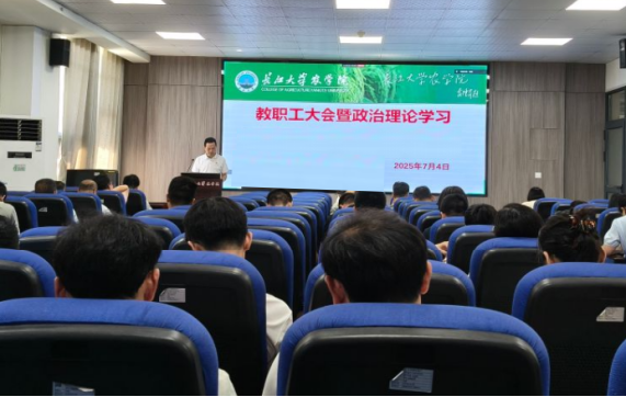 (通讯员 王雪)7月4日下午,世界杯官网在农科大楼3073会议室召开全体教职工大会,开展7月份政治理论学习,通报和安排近期主要工作,学院党委书记周锦华主持会议。