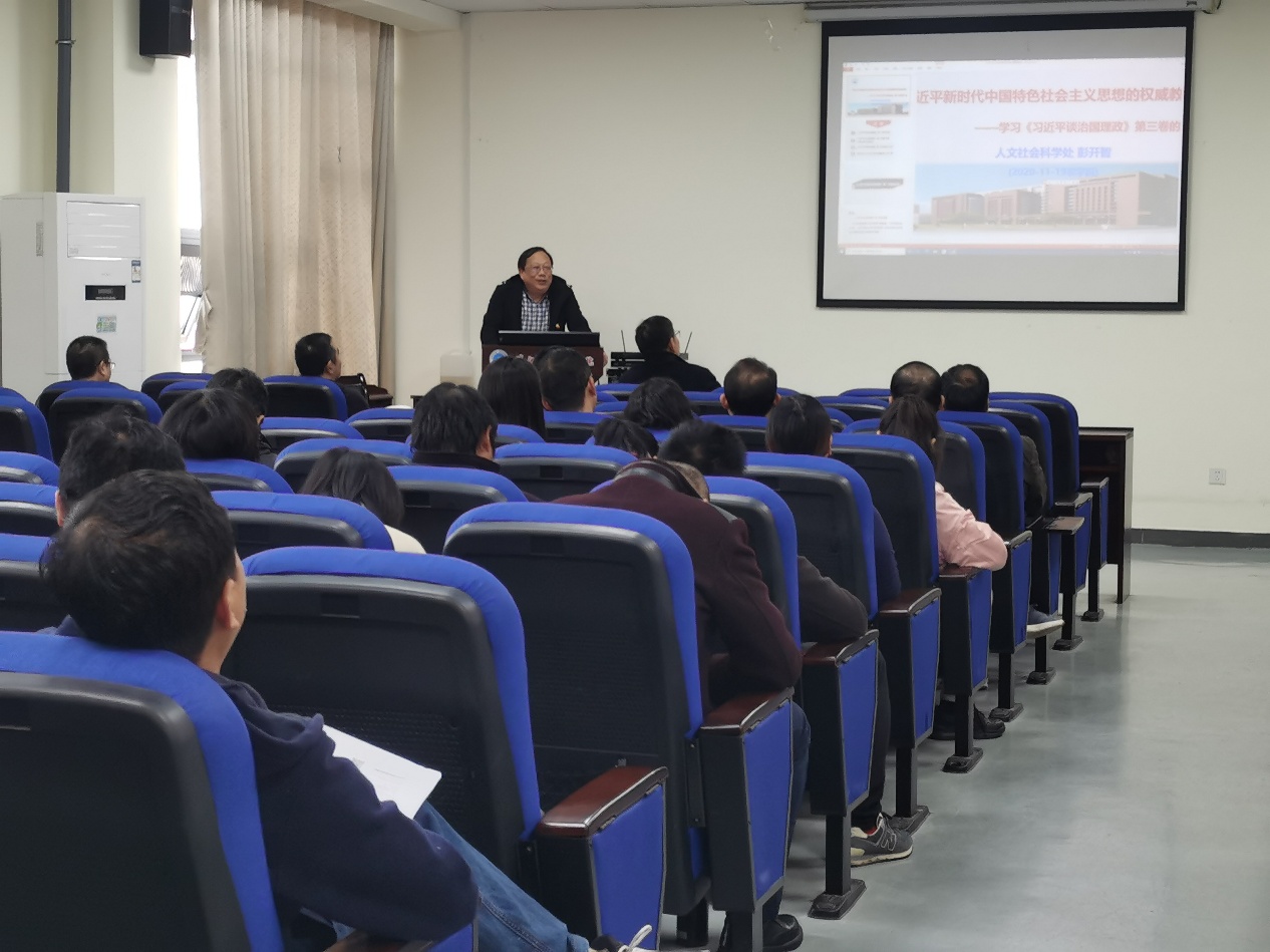 根据学校党委组织部、宣传部部署和工作要求,结合理论学习工作安排,11月19日下午,世界杯官网党委在在农科大楼3073会议室举行《习近平谈治国理政》第三卷学习报告会暨学院党委理论学习中心组(扩大)学习会。会议由学院党委书记冯发明主持,人文社会科学处副处长彭开智作专题报告,学院全体教工参加会议。