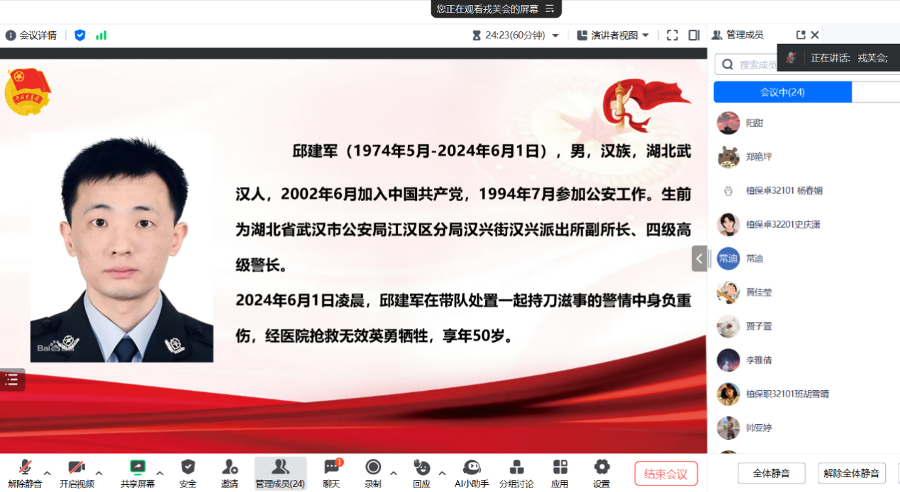 随后,戎芙会同志带领全体党员一起学习“湖北省优秀共产党员”邱建军同志的先进事迹,号召大家以邱建军同志为榜样,厚植英雄情怀,激励报国之志,发扬其精神风范,唱响共产党好、社会主义好、改革开放好、伟大祖国好、各族人民好的时代旋律,并从他身上汲取奋发前行的力量,为全面建设社会主义现代化国家、全面推进中华民族伟大复兴而团结奋斗。