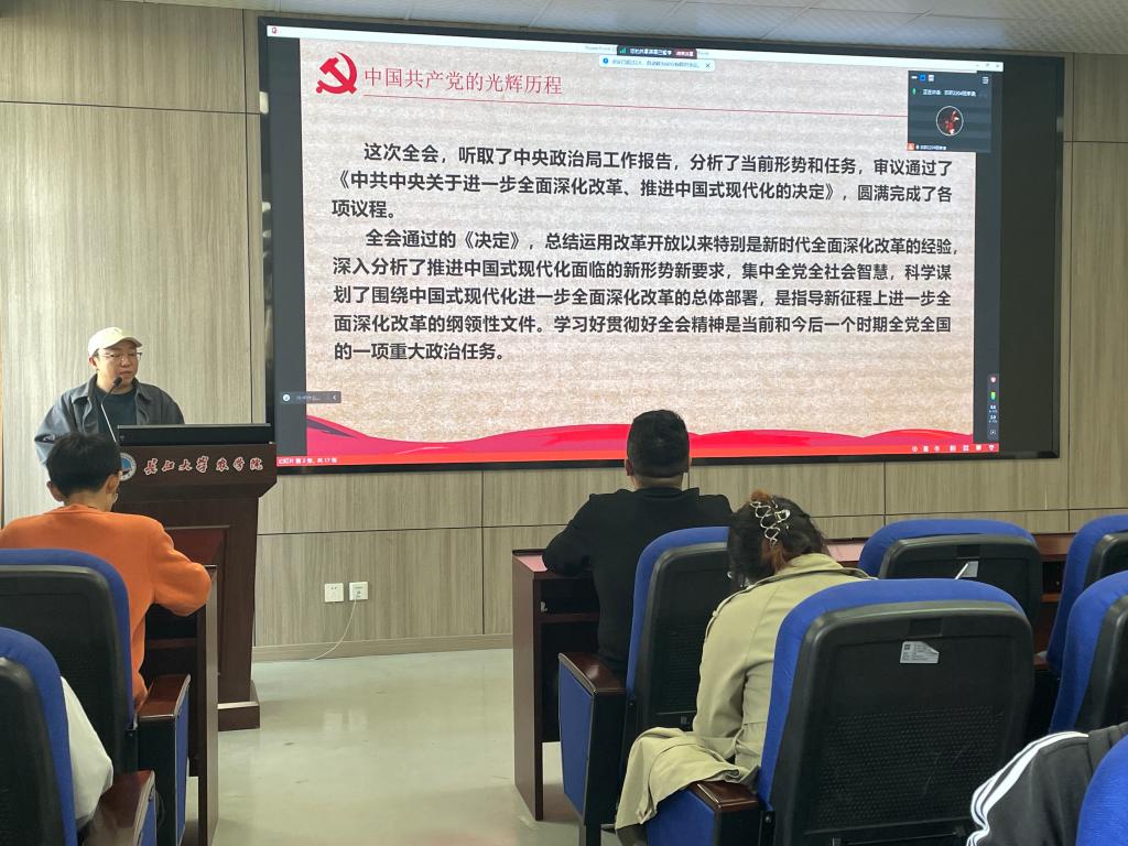 全体党员重温入党誓词;纪检委员罗丽娅对本月支部党费收缴情况进行简要说明;朱嘉怡带领全体党员学习《中国共产党章程》(第一章);陈子方分享学习“党的二十届三中全会精神”心得体会;黄思怡、舒娇领学党的创新理论;参会党员结合自身经历,以“深入学习领会党的二十届三中全会精神,落实省十二届七次全会部署要求”为题开展研讨交流。