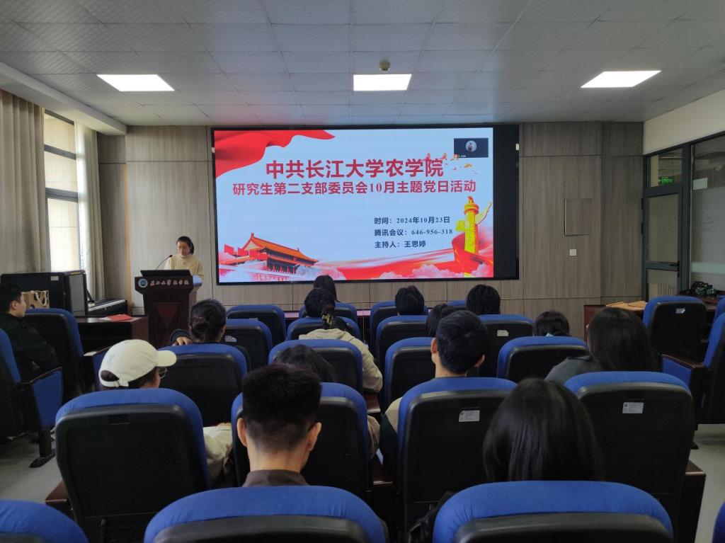 (通讯员 任娇 宋梦圆)2024年10月23日,我院研究生第二党支部在农科大楼3073会议室开展十月份主题党日活动,活动结合腾讯会议(ID:646 956 318)的方式同时在线上召开。全体在校党员和校外联培党员共同参与,活动由王思婷同志主持。