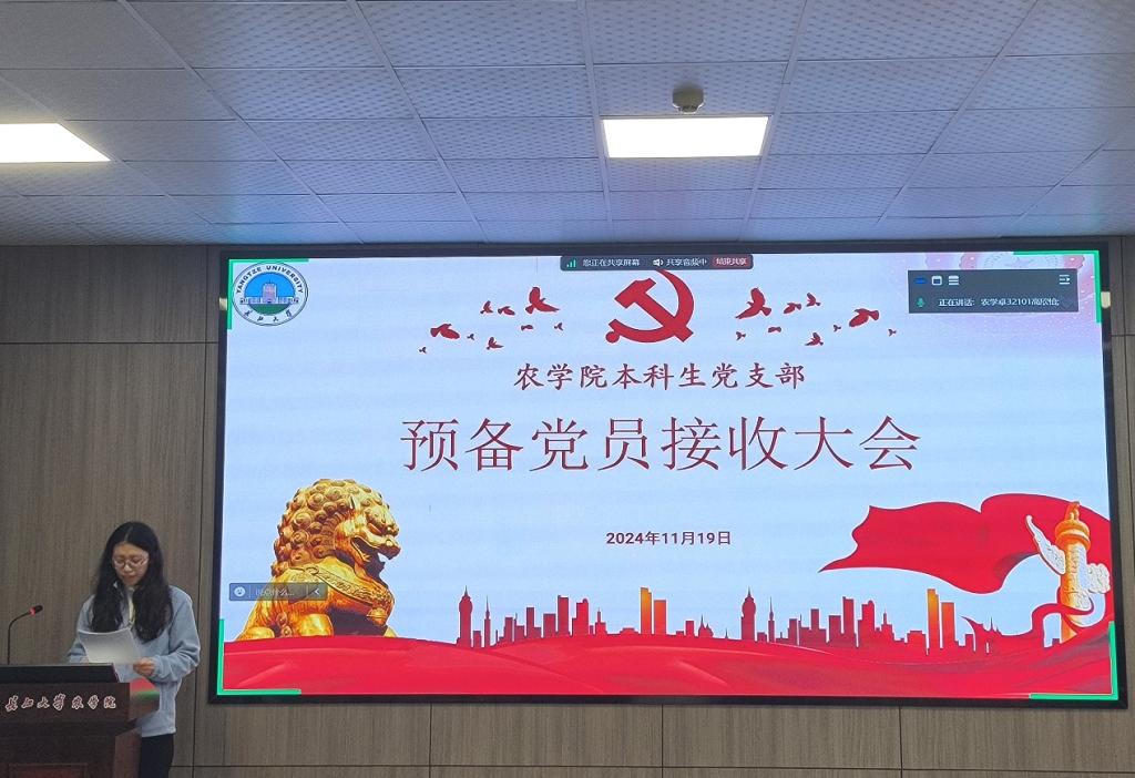 (通讯员 武芊睿)为发展壮大党员队伍,充实党的新生力量,11月19日,世界杯官网本科生党支部在农科大楼3073召开2024年下半年预备党员接收大会,活动以线上线下相结合的方式开展,讨论发展对象张旭阳等9名同志的入党问题。应到会党员27名,实到会20名,应到会有表决权的正式党员9人,实到会7名,超过半数,符合党员发展流程。会议由支部副书记高欣怡同志主持。