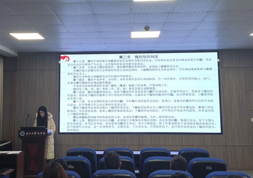 会议伊始,组织委员曾袁琳珺同志带领全体党员重温入党誓词,高欣怡同志对本月党费交纳情况进行了简要说明,全体党员共同学习《中国共产党章程》第二章关于党的组织制度的相关内容。