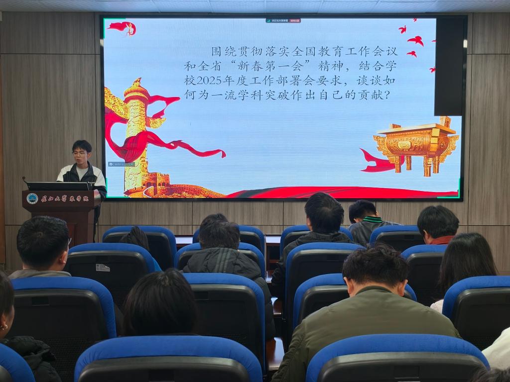 活动中,张银带领全体党员重温入党誓词,罗丽娅简要说明了本月党支部党费收缴情况。唐海洋带领全体党员学习《中国共产党章程》(第四章),黄思怡为全体党员讲授《做合格党员》微党课。邓元凯、张银带头领学了习近平总书记近期重要讲话和重要指示批示精神。朱嘉怡、李艺德结合学习工作实际,围绕贯彻落实全国教育工作会议和全省“新春第一会”精神,结合学校2025年度工作部署会要求,开展研讨交流。