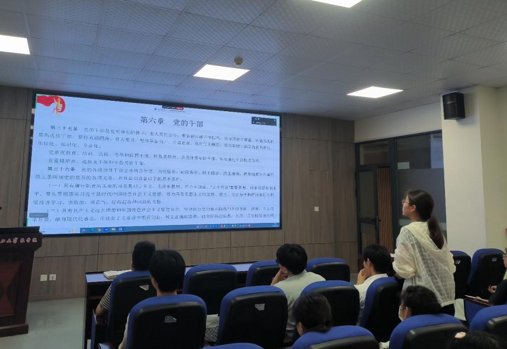 会议伊始,曾袁琳珺同志带领全体党员重温入党誓词;纪检委员刘天雅同志对本月党费交纳情况进行了简要说明;全体党员共同学习《中国共产党章程》第六章关于党的干部相关内容。