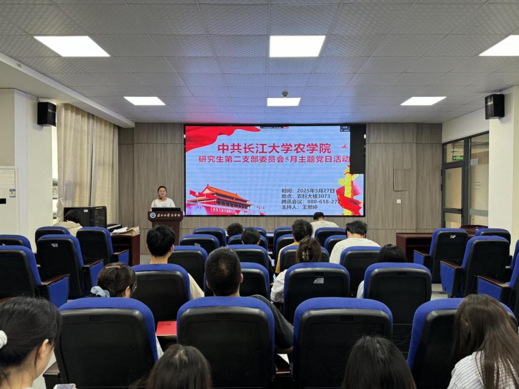 (通讯员 任娇)5月27日,我院研究生第二党支部在农科大楼3073会议室开展5月份主题党日活动,活动结合腾讯会议(ID:880 618 272)的方式同时在线上召开。全体在校党员和校外联培党员共同参与,活动由王思婷同志主持。