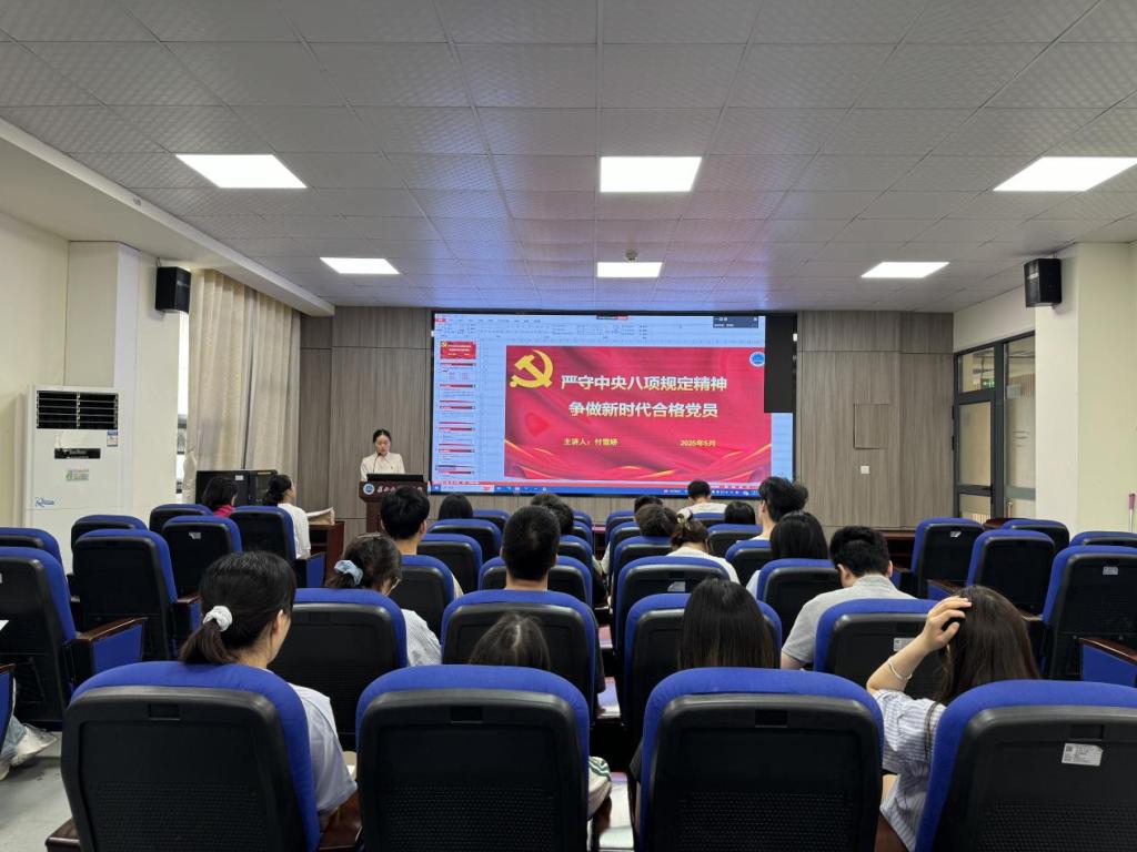 会上,支部书记付雪娇以“严守中央八项规定精神 争做新时代合格党员”为主题向全体党员讲授党课,她从中央八项规定出台的背景、八项规定内容、重要意义、反面案例以及如何践行中央八项规定精神五个方面进行了详细讲解。她表示,中央八项规定,是新时代中国共产党人一张闪亮的“金色名片”,新时代青年肩负着服务党和国家发展大局的重任,我们要坚定理想信念,加强理论学习;践行群众路线,密切联系群众;立足本职岗位,勇于担当作为;时刻牢记党员身份,用实际行动诠释共产党员的初心使命。