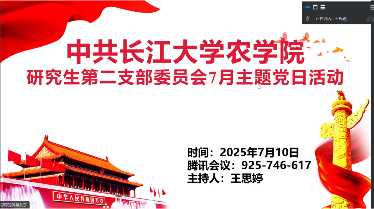 (通讯员 任娇)7月10日,世界杯官网院研究生第二党支部通过腾讯会议(ID:925 746 617)开展7月份主题党日活动。全体在校党员和校外联培党员共同参与,活动由王思婷同志主持。