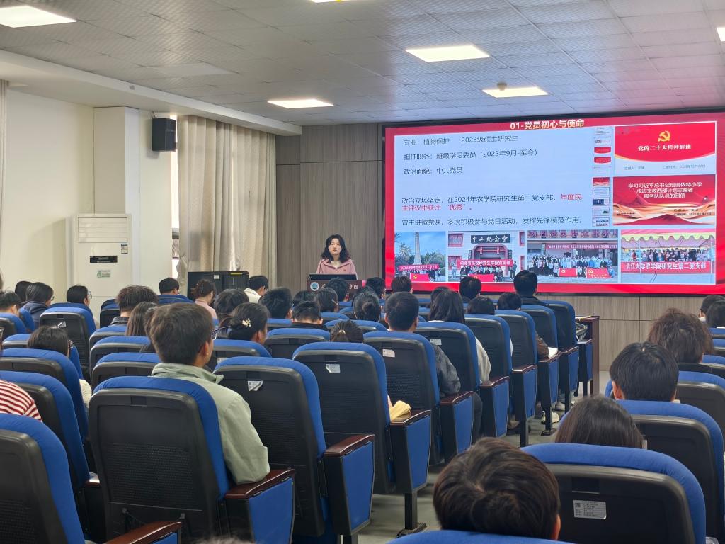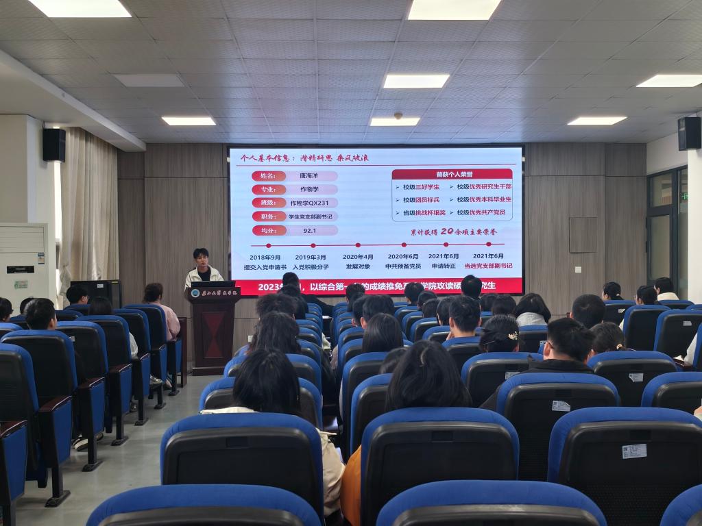 “我们要以师兄师姐们为榜样,坚定理想信念,锤炼科研本领,努力成为有理想、敢担当、能吃苦、肯奋斗的新时代合格党员。”新生党员冀莹莹分享学习心得体会。