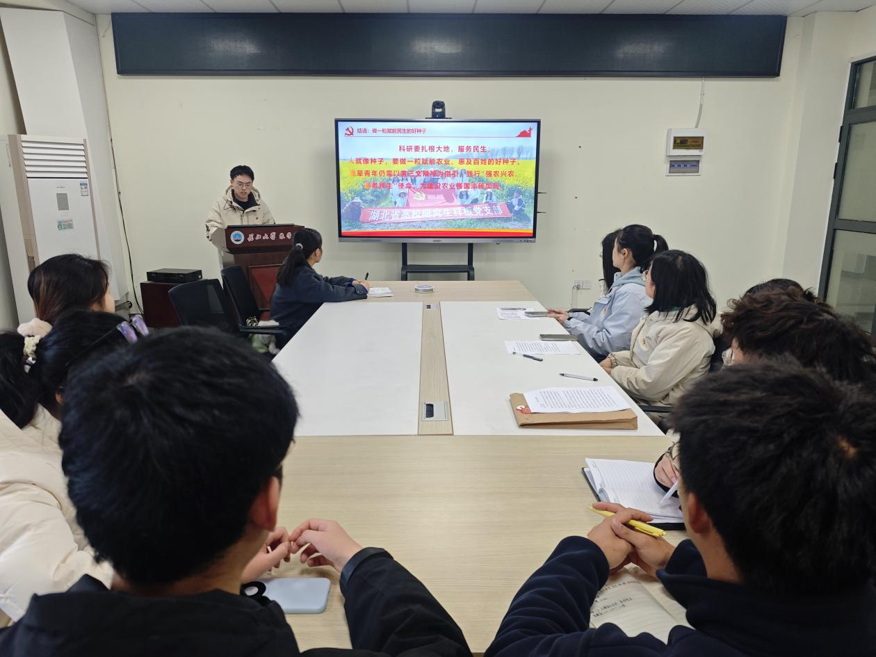 在交流研讨环节,与会党员以“深入学习贯彻党的二十届四中全会精神,结合《奋进“十五五”建功“双一流”——2026世界杯官网2026年新年献词》为主题展开讨论。王紫宜、帅亚婷、蔡露同志表示,将以长大精神为指引,立足专业研究,扎根基础领域、积极交流学习,深耕绿色防控病虫害研究,以专业本领为农业强国和母校“双一流”建设助力;将紧扣农业生产实际,完成毕业论文并凝练落地成果,秉持长大精神聚焦流域作物病害防控,为农业安全献力,为守护湖北粮食安全筑牢“隐形防线”。