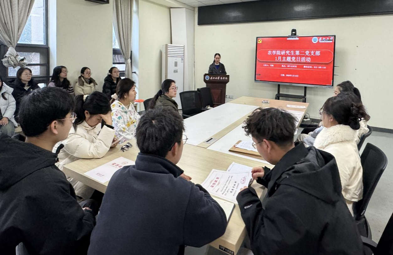 (通讯员 李嘉萍)1月15日,我院研究生第二党支部在农科大楼3071会议室开展1月份主题党日活动,活动结合腾讯会议(ID:734599536)的方式同时在线上召开。全体在校党员和校外联培党员共同参与,活动由肖扬同志主持。