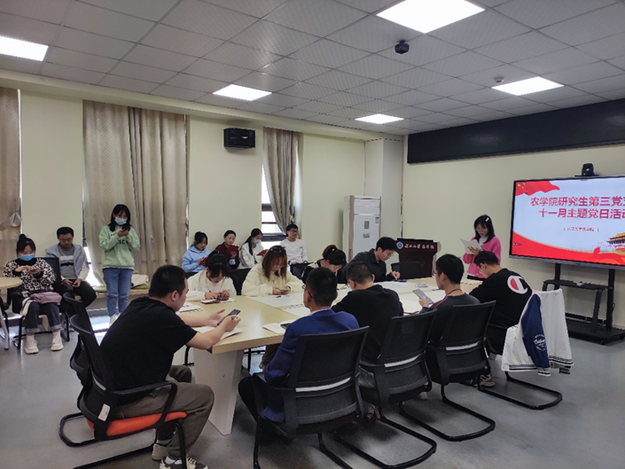 (通讯员 邹宇傲)11月17日中午12:30,我院研究生第三党支部在农科大楼3071开展11月主题党日活动暨支委会选举仪式。活动结合腾讯会议的方式开展,全体在校党员和校外联培党员参与了此次活动,本次活动由支部党员杨彩仙同志主持。