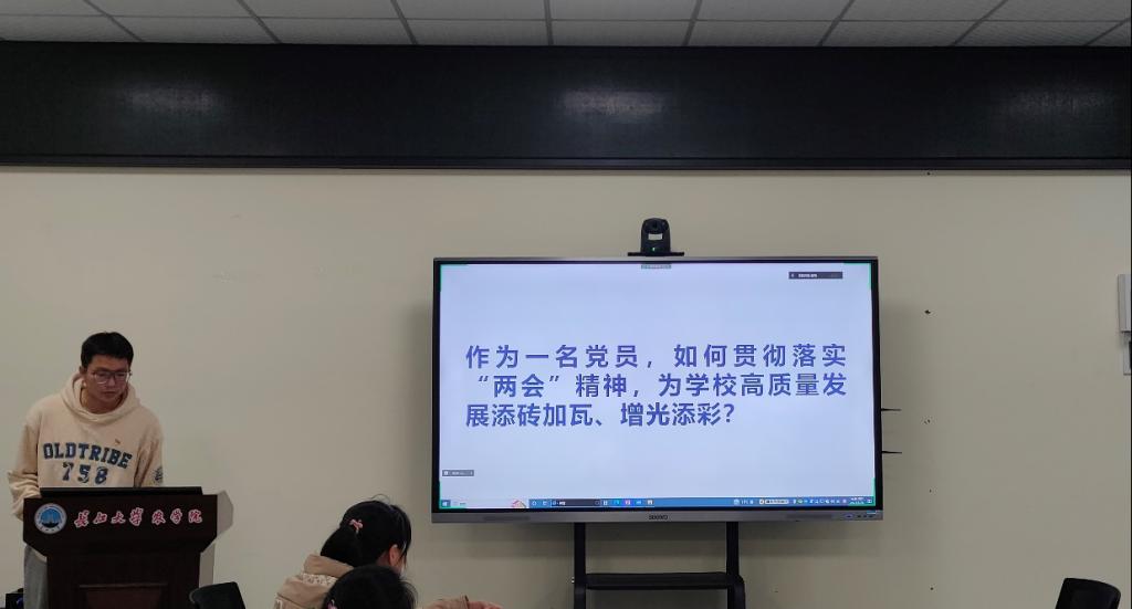 会议最后,支部书记付雪娇同志以“学、悟、落”三字作总结发言。“学”是学原文、学讲话,将两会精神与二十大精神贯穿始终。“悟”是悟原理,我们要通过学习,悟出真正道理,深入和全面掌握党的政策方针,用理论知识带动实践,用实践反馈理论知识。“落”是落到实处,习近平总书记在党的二十大报告中号召全党同志要坚持“三个务必”,务必不忘初心、牢记使命,务必谦虚谨慎、艰苦奋斗,务必敢于斗争、善于斗争。对于学生党员来讲,要谨记自己身上肩负的时代责任感,以时不我待的精神去承担各项工作。