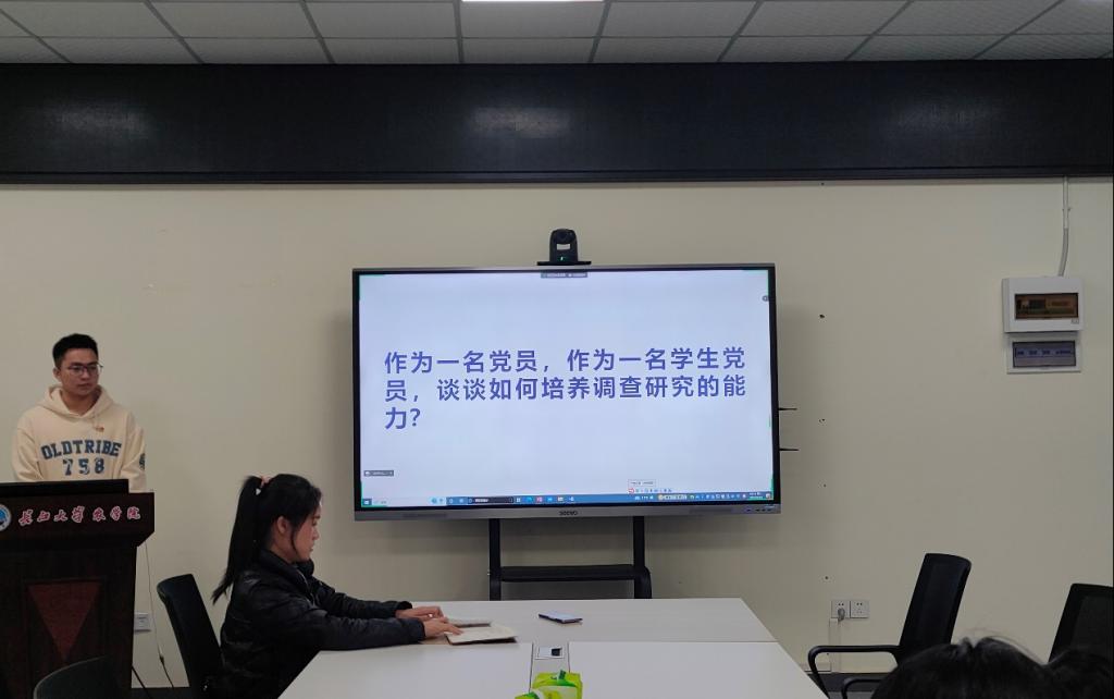 全体党员以“作为一名学生党员,谈谈如何培养调查研究的能力”为主题展开研讨。马白鸽同志认为,可以通过组织或参加调研活动培养调查研究的能力。刘曼莹同志认为要做到以下三点;第一,寻根究底,探源溯流。在学习中应该杜绝蜻蜓点水式的研究,要多查阅文献,力求准确。第二,把准问题,精准开方。始终强化问题导向,凡事多问为什么,要刨根问底,深研细究,找出解决方案。第三,勤思善思,破题解题。列出学习中的问题清单,对能及时解决的问题马上去办,对于难以解决的问题要紧跟不放,扩充知识,不断尝试解决。