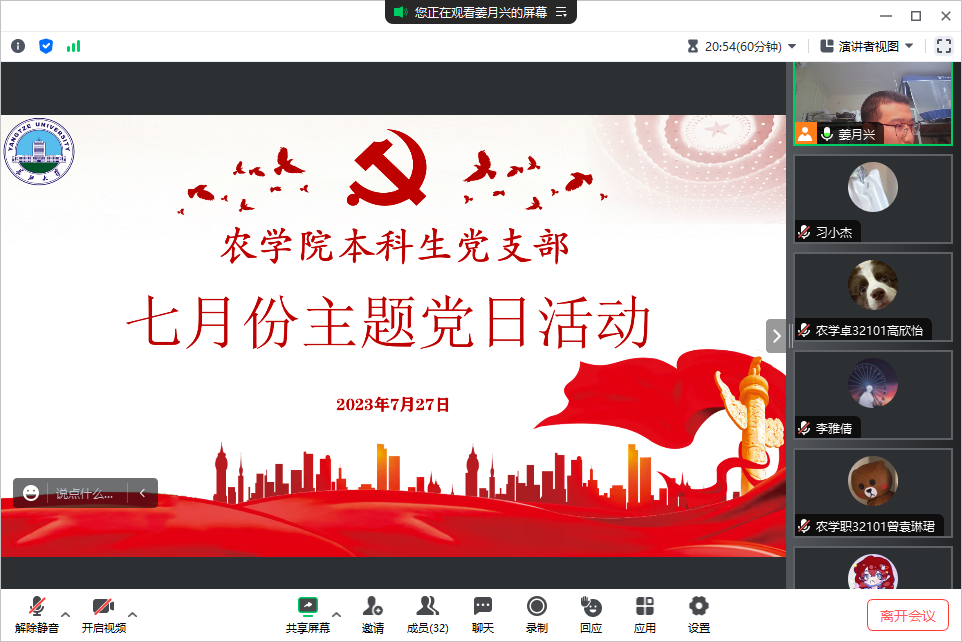 (通讯员 徐志鹏)7月27日晚上19:00,我院本科生党支部在腾讯会议开展七月主题党日活动。本次活动由支部党员姜月兴同志主持。
