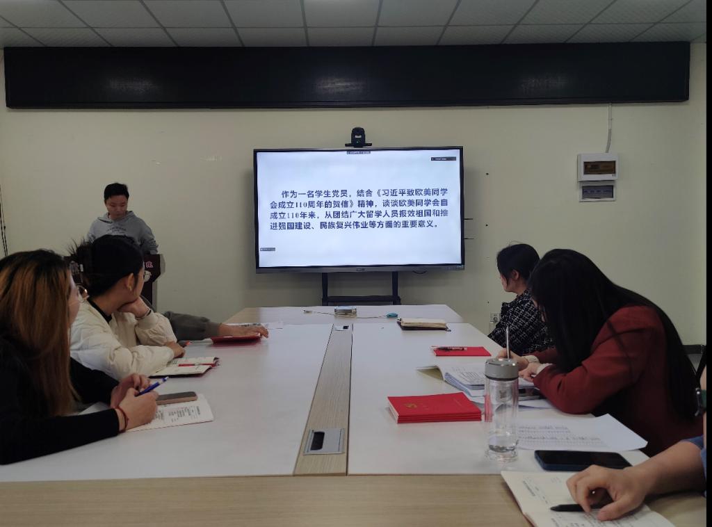 接着,全体党员以“作为一名学生党员,结合《习近平致欧美同学会成立110周年的贺信》精神,谈谈欧美同学会自成立110年来,从团结广大留学人员报效祖国和推进强国建设、民族复兴伟业等方面的重要意义”为主题展开研讨,赵伟同志认为外出留学的学生应发挥自身优势,发挥创造力,在科研的道路上矢志不渝地为祖国做贡献。田尧同志认为作为一名外出的留学生,要时刻牢记外出是为了学习更多知识,回国助力国家事业发展,并且在留学期间,要弘扬中华传统文化,为推动中华传统文化的发展贡献自己的力量。