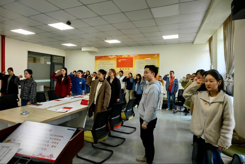 会议伊始,宋梦圆同志带领全体党员重温入党誓词,韩晓文同志对本月党费交纳情况进行了说明,全体党员诵读《中国共产党章程<修正案>》第九章相关内容。随后进入党课(微党课)与集体学习党的创新理论环节,由麻朝兰同志讲授党课《高举中国特色社会主义伟大旗帜为全面建设社会主义现代化国家而团结奋斗》、简渝丹同志讲授微党课《中国共产党光辉历程》;严晓羽、李可可同志带领学习《习近平总书记在中共中央政治局第九次集体学习时强调 铸牢中华民族共同体意识 推进新时代党的民族工作高质量发展》、《<求是>杂志发表习近平总书记重要文章<开辟马克思主义中国化时代化新境界>》;周停、黄婷同志带领学习《中国共产党支部工作条例(试行)》第四章至第八章、学习习近平总书记致欧美同学会成立110周年的贺信(全文),最后由马发兵同志分享个人先进事迹。