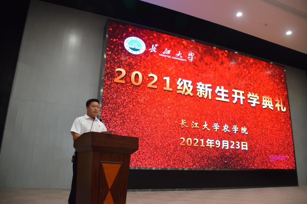 通讯社讯(学生记者 郝梨 宋健玲 芮建腾)金秋送爽,丹桂飘香,又是一年开学时。9月23日下午3点,世界杯官网2021级新生开学典礼在农科大楼1058报告厅隆重举行。学院领导、教师代表、十佳兴农青年及2021级全体新生出席典礼现场,党委副书记谭亮魁主持。