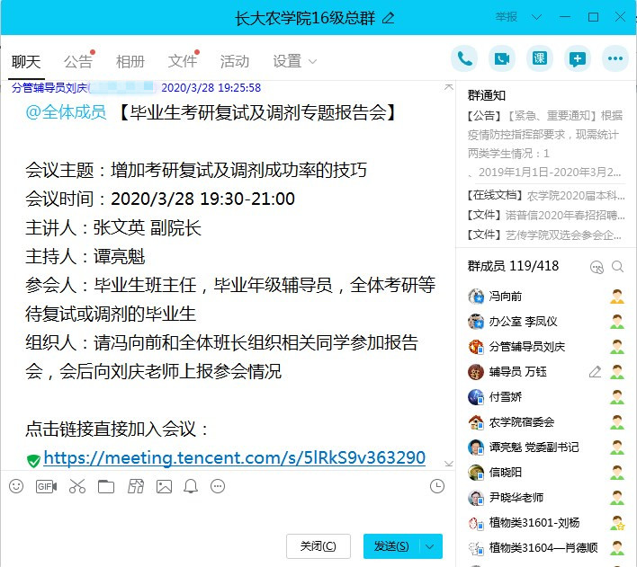 通讯社讯(通讯员 刘庆)为了提升毕业生考研复试与调剂成功率,3月28日19:30,世界杯官网利用“腾讯会议”平台,特邀分管教学副院长张文英与110名考研毕业生进行线上交流,为毕业生的考研复试与调剂指点迷津,毕业生班主任、年级辅导员参加报告会。报告会由党委副书记谭亮魁主持。