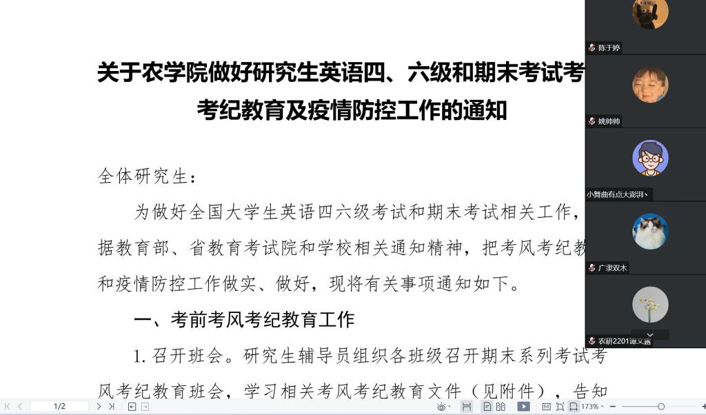 各研究生班级全覆盖认真学习相关考风考纪教育文件。通过宣讲违纪文件、处分案例的方式做好警示教育,重点学习了学生考试违纪、作弊的认定及处理办法。针对因疫情不能参加考试的学生,各班级进行了一对一认真排查并统计信息,全体参加考试的研究生按要求签订《诚信考试承诺书》。