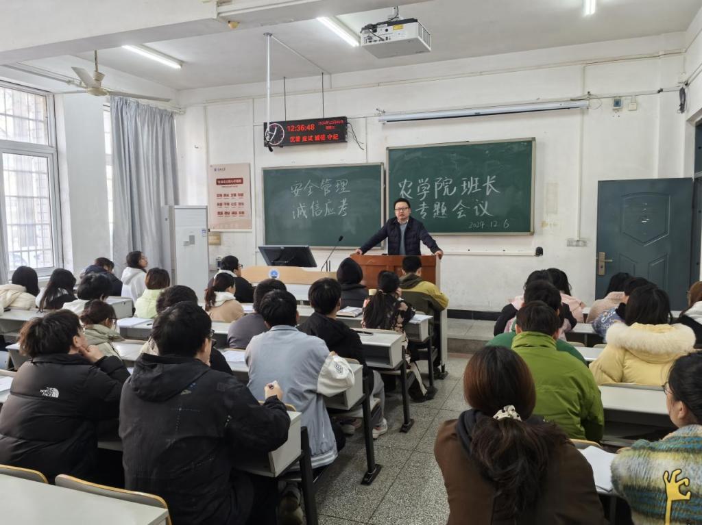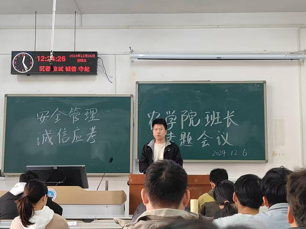 (通讯员 李奥明洋)为进一步加强学生安全管理、提升诚信应考意识,并针对新洋丰订单班的特殊需求进行讨论,世界杯官网于2024年12月6日召开了学院班长例会。会议由世界杯官网学工办主任黄承石老师主持,学院党委副书记尹小华老师以及全体本科生和研究生班长参加会议。