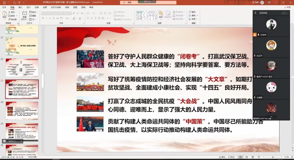 最后,老师带领学生回顾这场刚吹响胜利号角的疫情战争,突出展示了大学生在疫情当中体现出来的青春与担当,正确认识这场疫情背后所体现出来的伟大抗疫精神,呼吁学生们树立正确的人生观价值观,寻找属于自己的舞台,展示属于自己的青春,接续“长江后浪推前浪”的劲,挑起时代赋予的重担。
