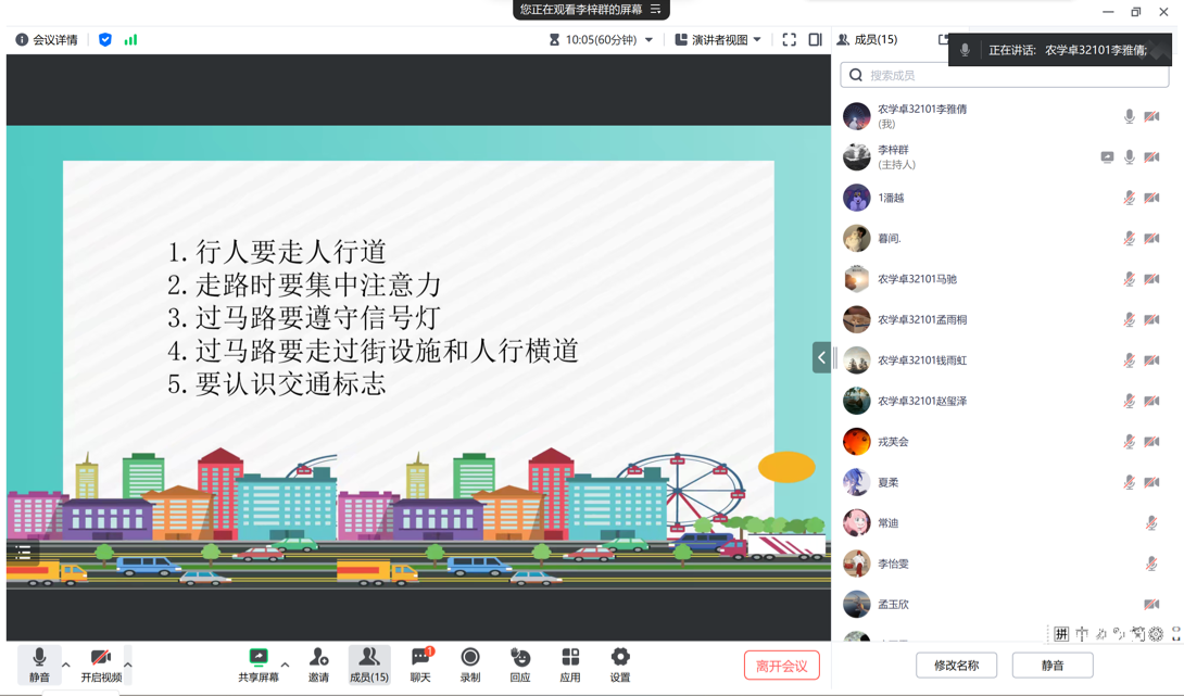 本次班会以班级为单位,各班安全委员重点围绕步行、乘车、骑车、水上交通安全等内容并借助ppt、视频为载体生动形象地向同学普及交通安全教育知识。除此之外,各班班主任还结合典型案例,重点讲解了常见交通意外案例,并提出了相应的应对策略,呼吁大家认真学习交通安全知识以提高防范意识。